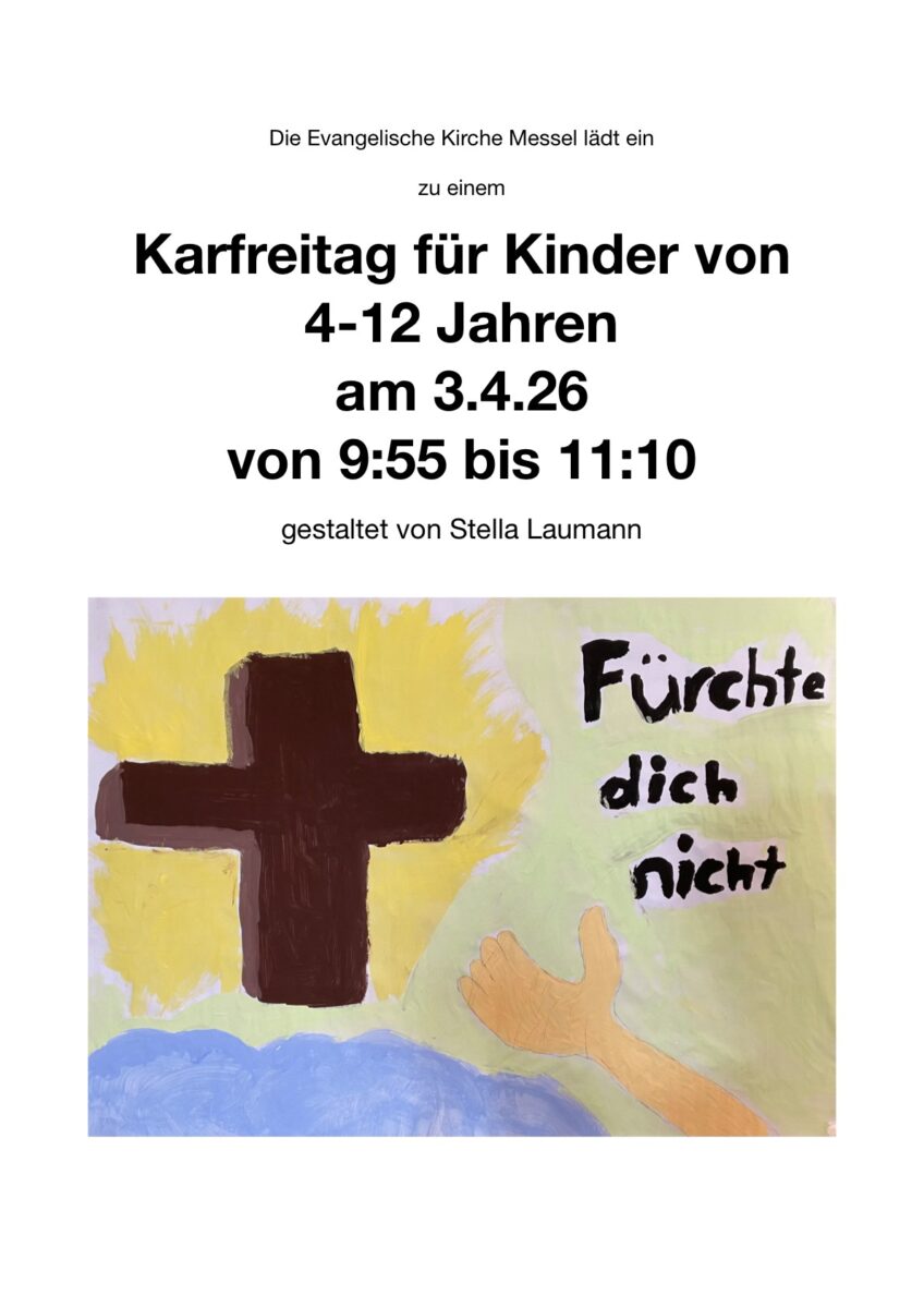 9:55 bis 11:10 Karfreitag für Kinder ab 4 Jahren im Evangelischen Gemeindehaus, gestaltet von Stella Laumann. So können Eltern und Großeltern in den Gottesdienst gehen, zum höchsten evangelischen Feiertag